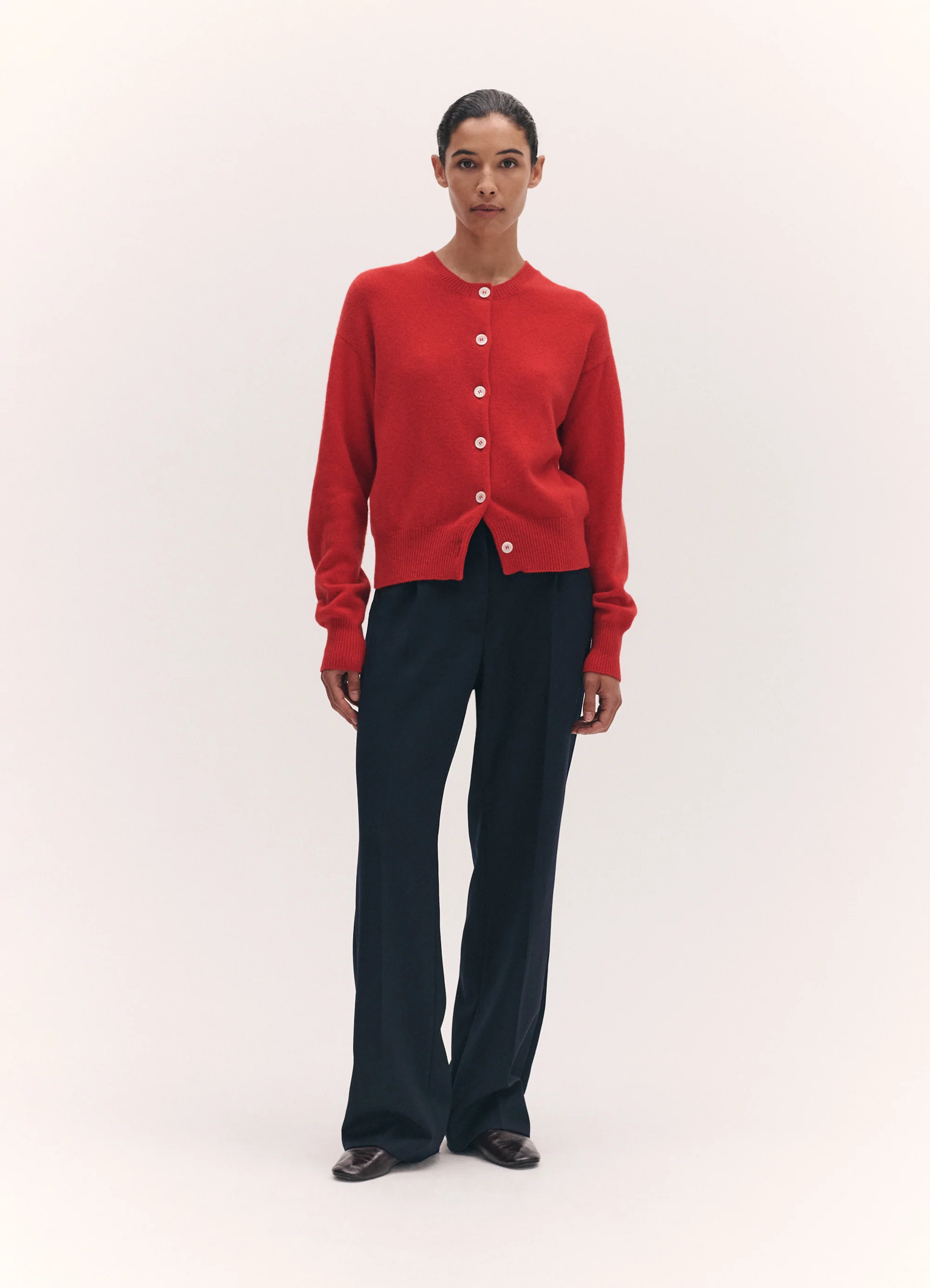 Maya wears the Ada Crewneck Cardigan in Poppy Red styled with the Fionn Cashmere Foulard in Derby Grey.