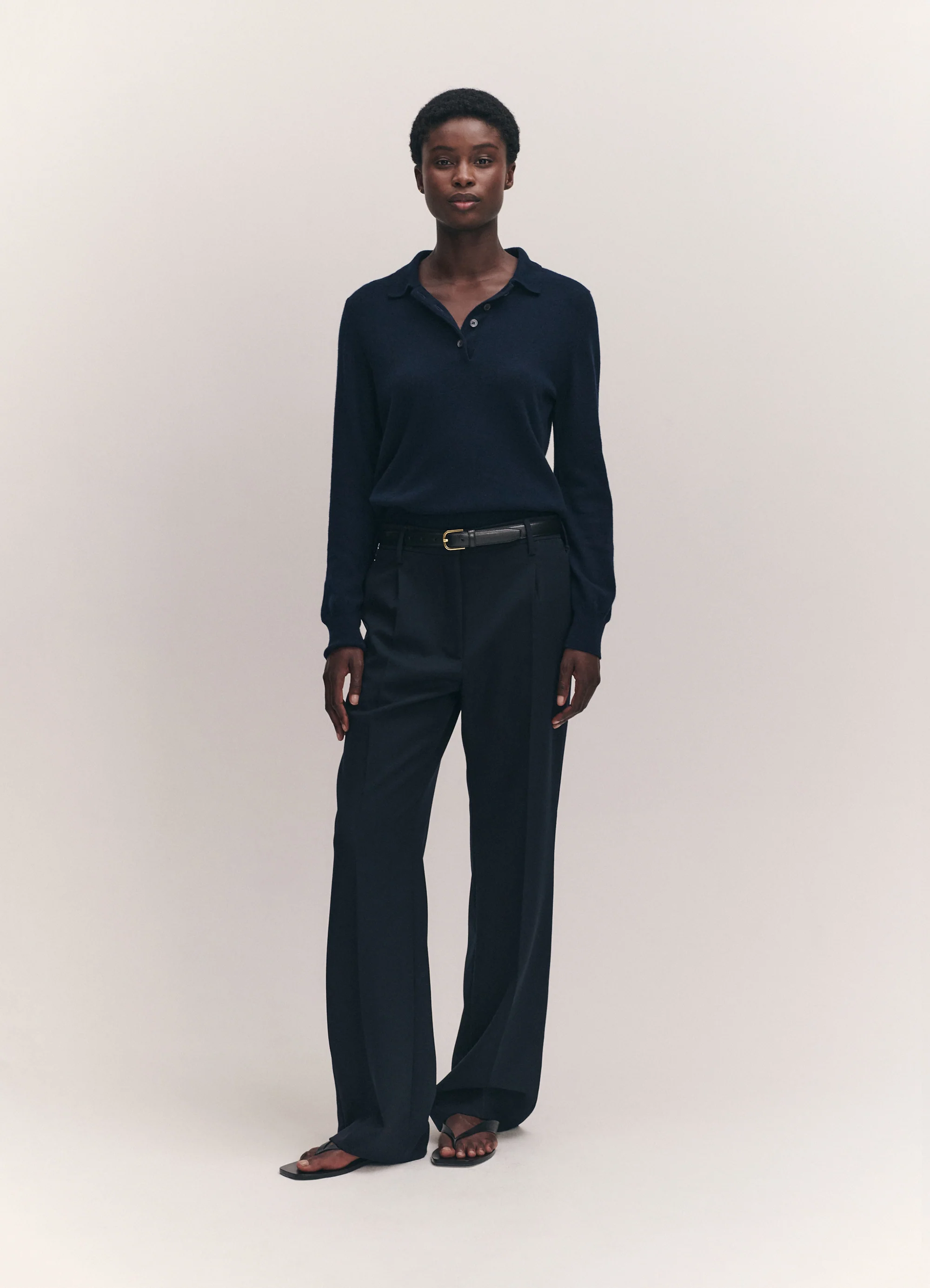 The Aoife Cashmere Polo Shirt. Crafted in Scotland from fine-spun, lightweight cashmere, in Dark Navy. Part of our Underpinnings collection: a foundational shape designed to be worn on its own or as an effortless transitional piece, easily layered.Ā