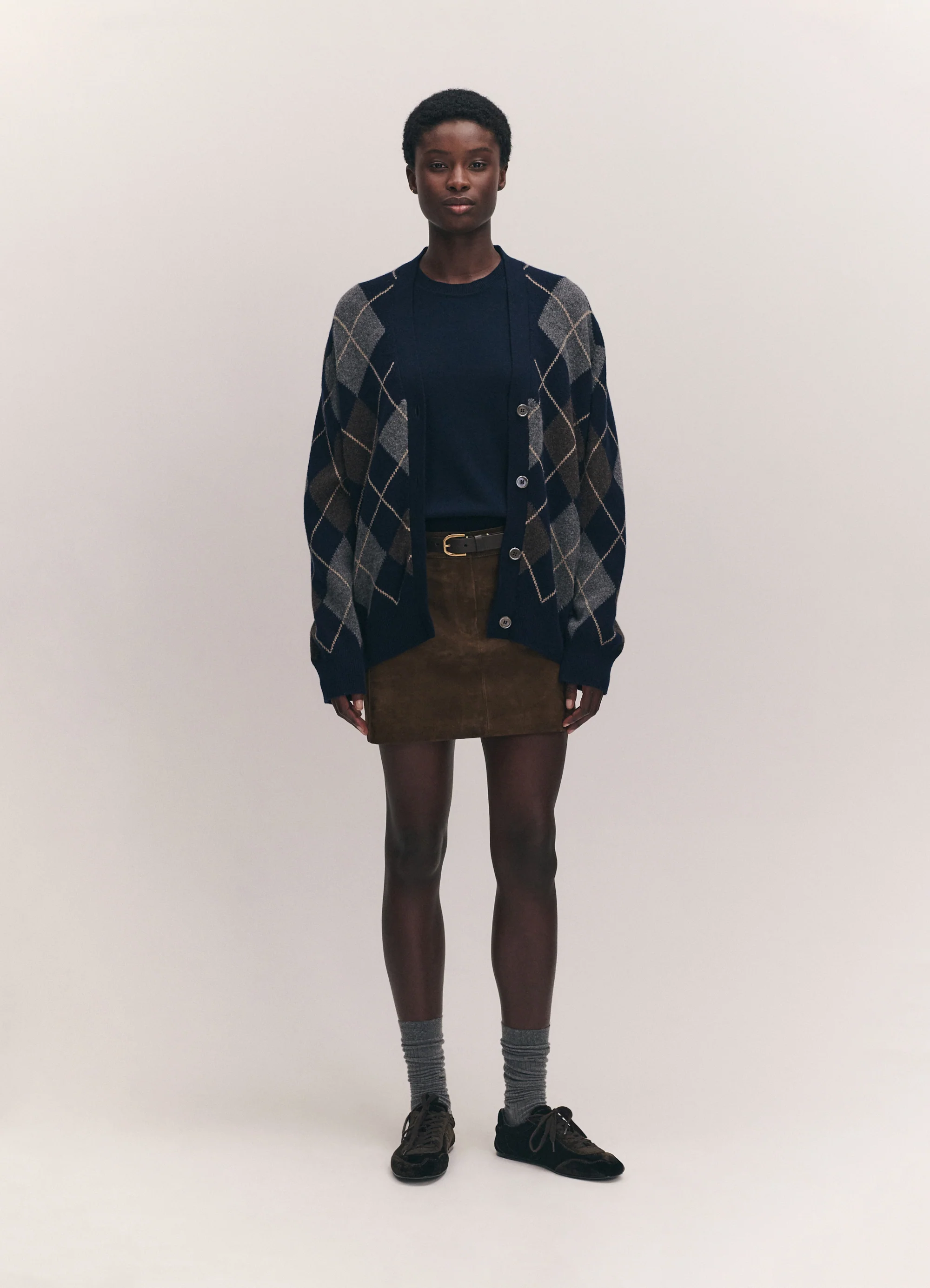 The Ava Argyle Cardigan in Navy with Brown, knit in super soft, Scottish-spun Geelong lambswool. Its silhouette is neither slim, nor oversized, a subtle slouch for ease of layering throughout the cooler months and an elegant drape.