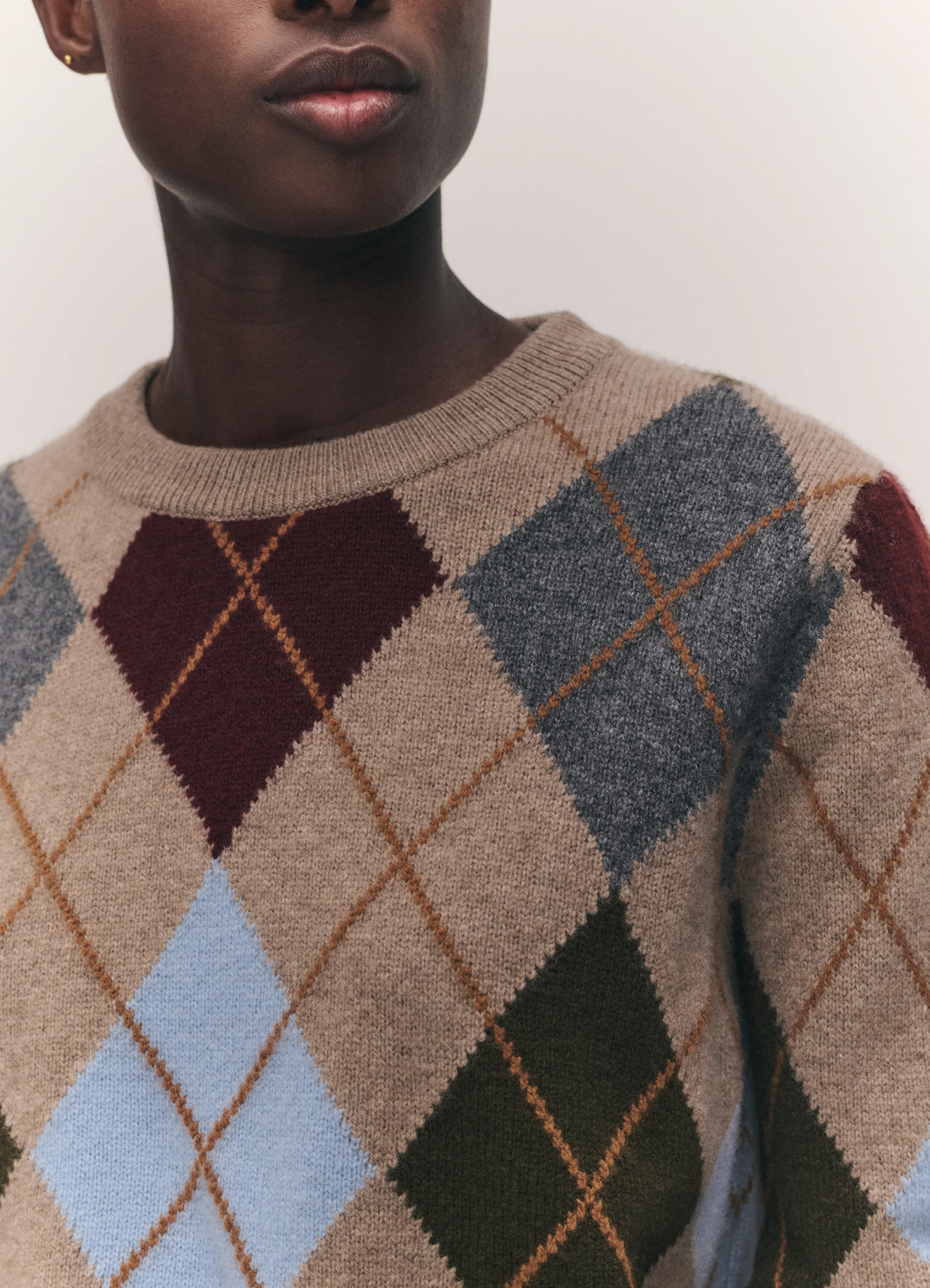 The Ava Argyle Crewneck in Dark Natural with Burgundy is knit in a super soft, Scottish-spun Geelong lambswool. Its silhouette has a subtle slouch for ease of layering throughout the cooler months and an elegant drape.