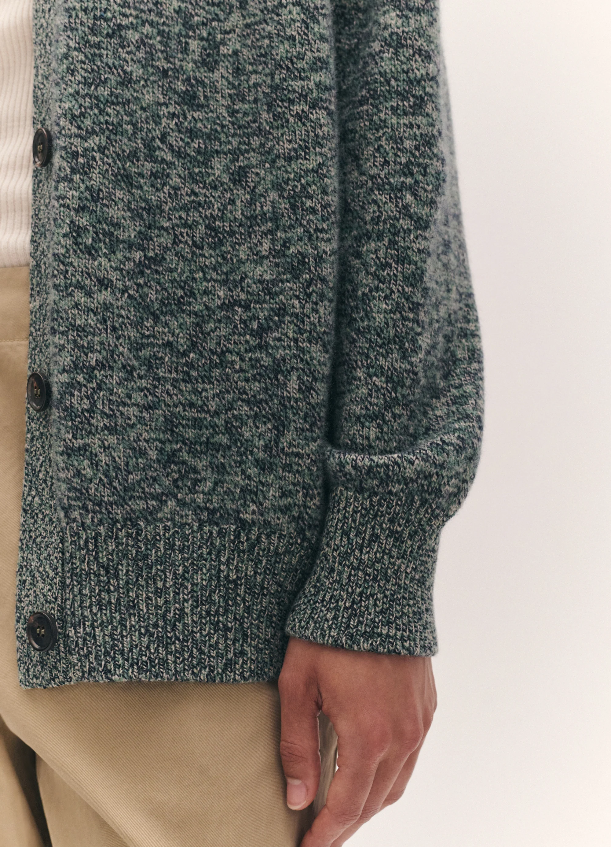 Introducing the Ava Cardigan in Mouline, knit in super soft, Scottish-spun Geelong lambswool. Mouline is a twisted yarn made up, in this style, of three shades, navy, oatmeal & strath green, creating a soft speckled appearance. Its silhouette is neither slim, nor oversized, and has a subtle slouch for ease of layering with an elegant drape.