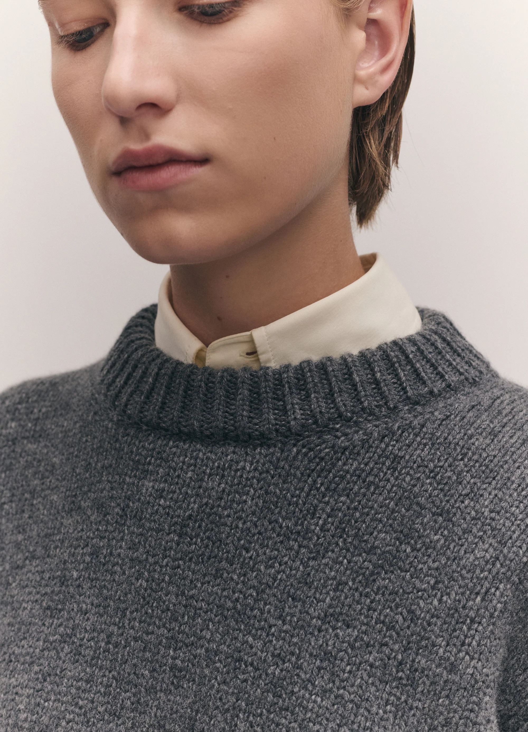 Knit in 100% Geelong Lambswool that is Responsible Wool Standard certified,Ā proportions are slouchy through the body and sleeve with chunky collar and cuffs.