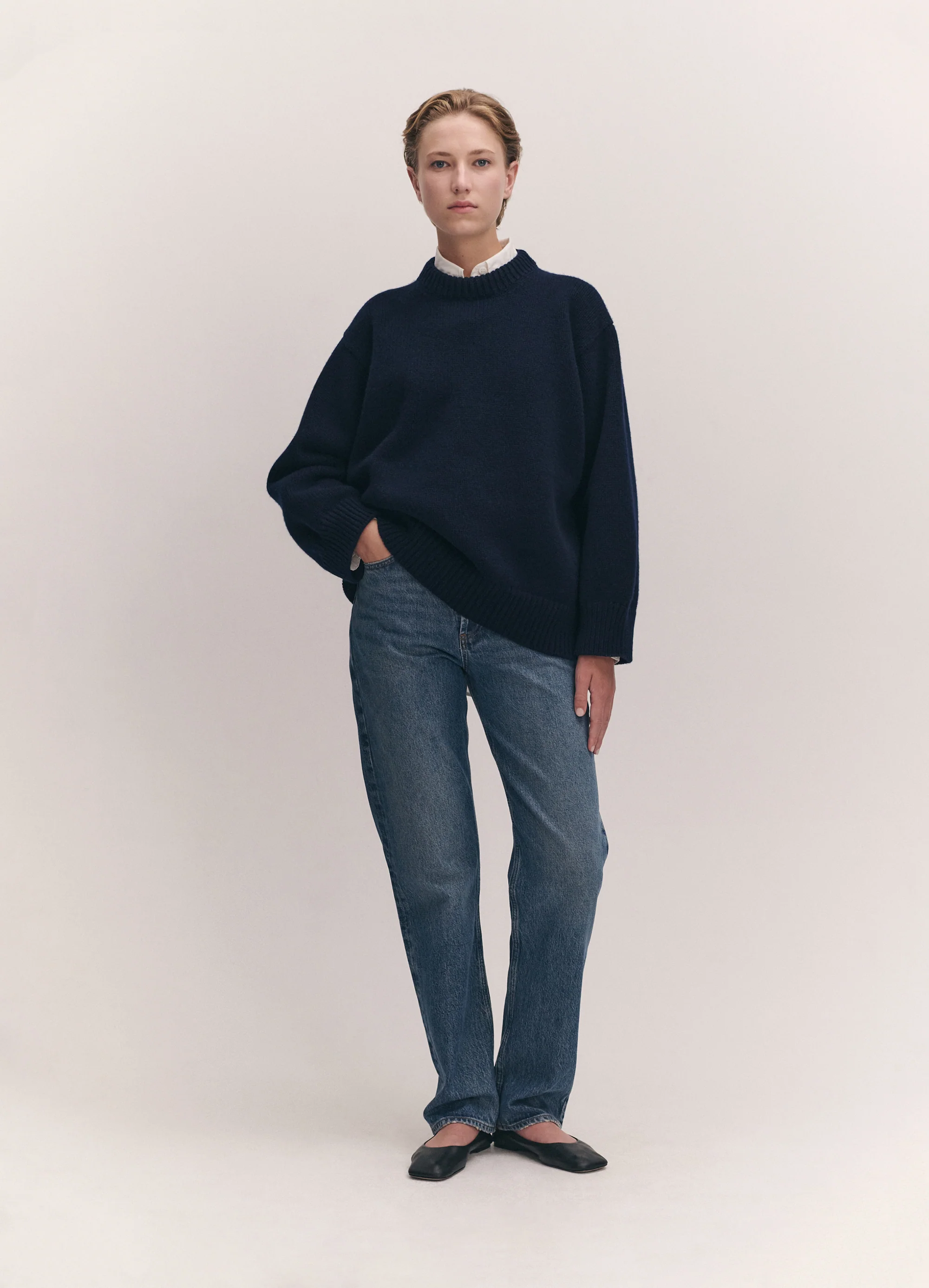 Knit in 100% Geelong Lambswool that is Responsible Wool Standard certified,Ā proportions are slouchy through the body and sleeve with chunky collar and cuffs.