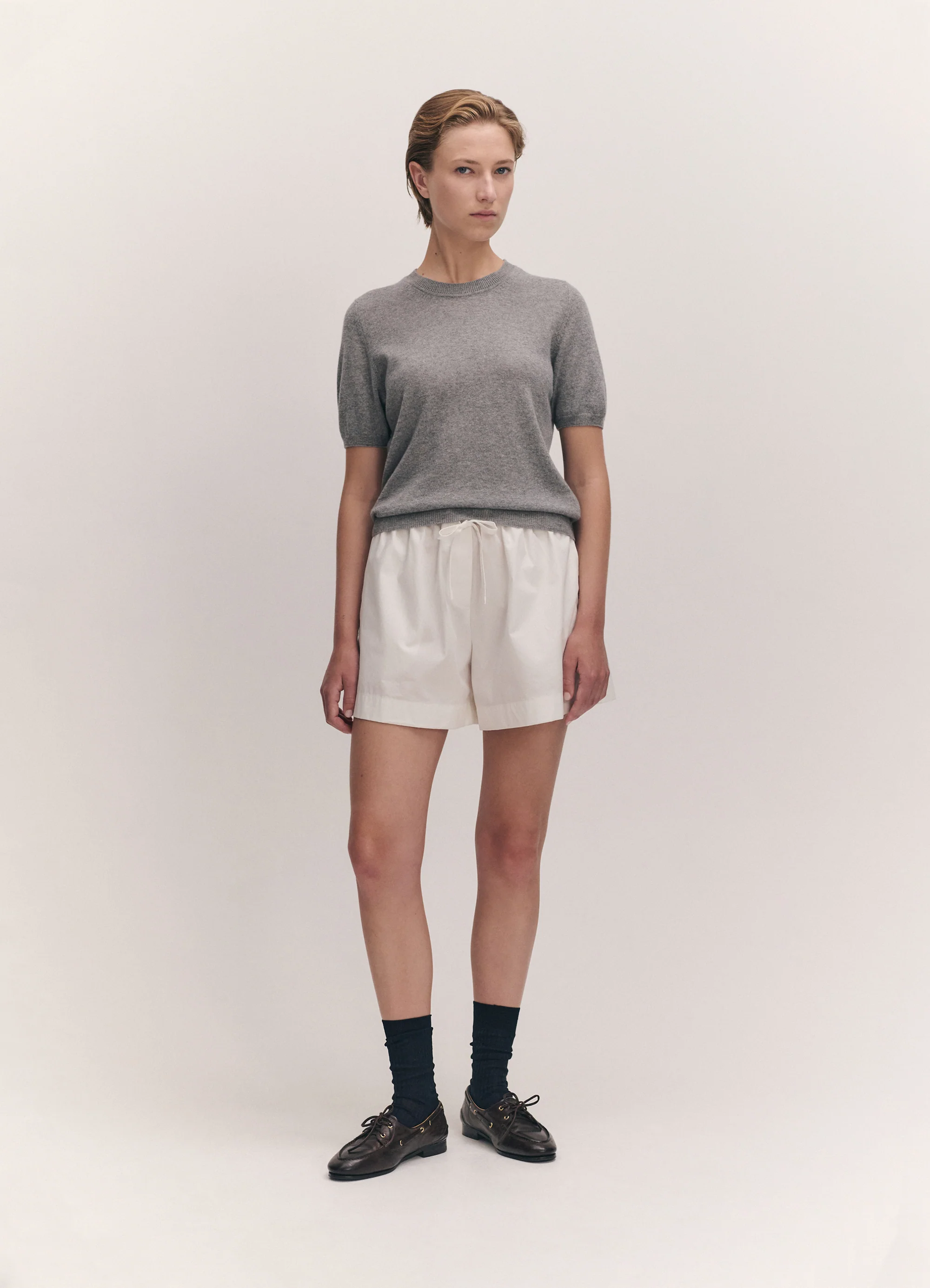 The Emer Cashmere T-Shirt, crafted in Scotland from fine-spun, lightweight cashmere. Part of our Underpinnings collection, the Emer is a foundational shape designed to be worn on its own or as an effortless transitional piece, easily layered.