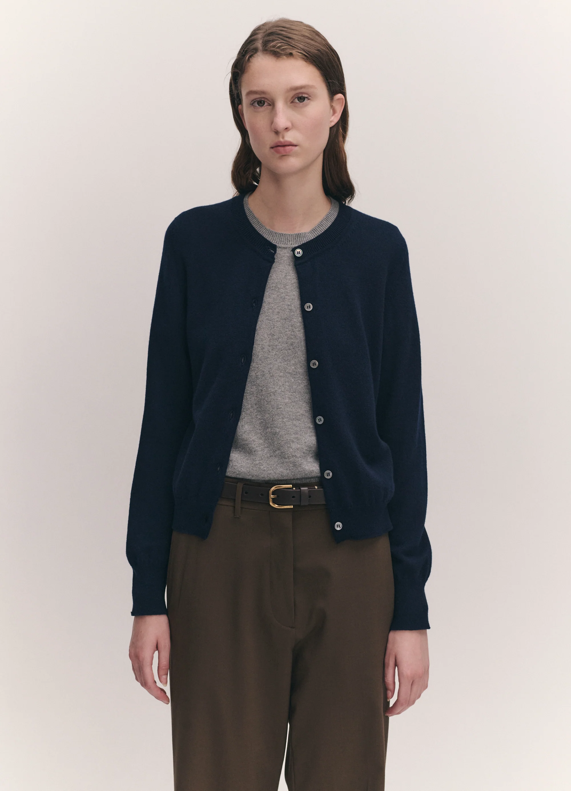 Stinne wears the Enya Cashmere Cardigan in Dark Navy styled with the Emer Cashmere T-Shirt in Soft Grey.