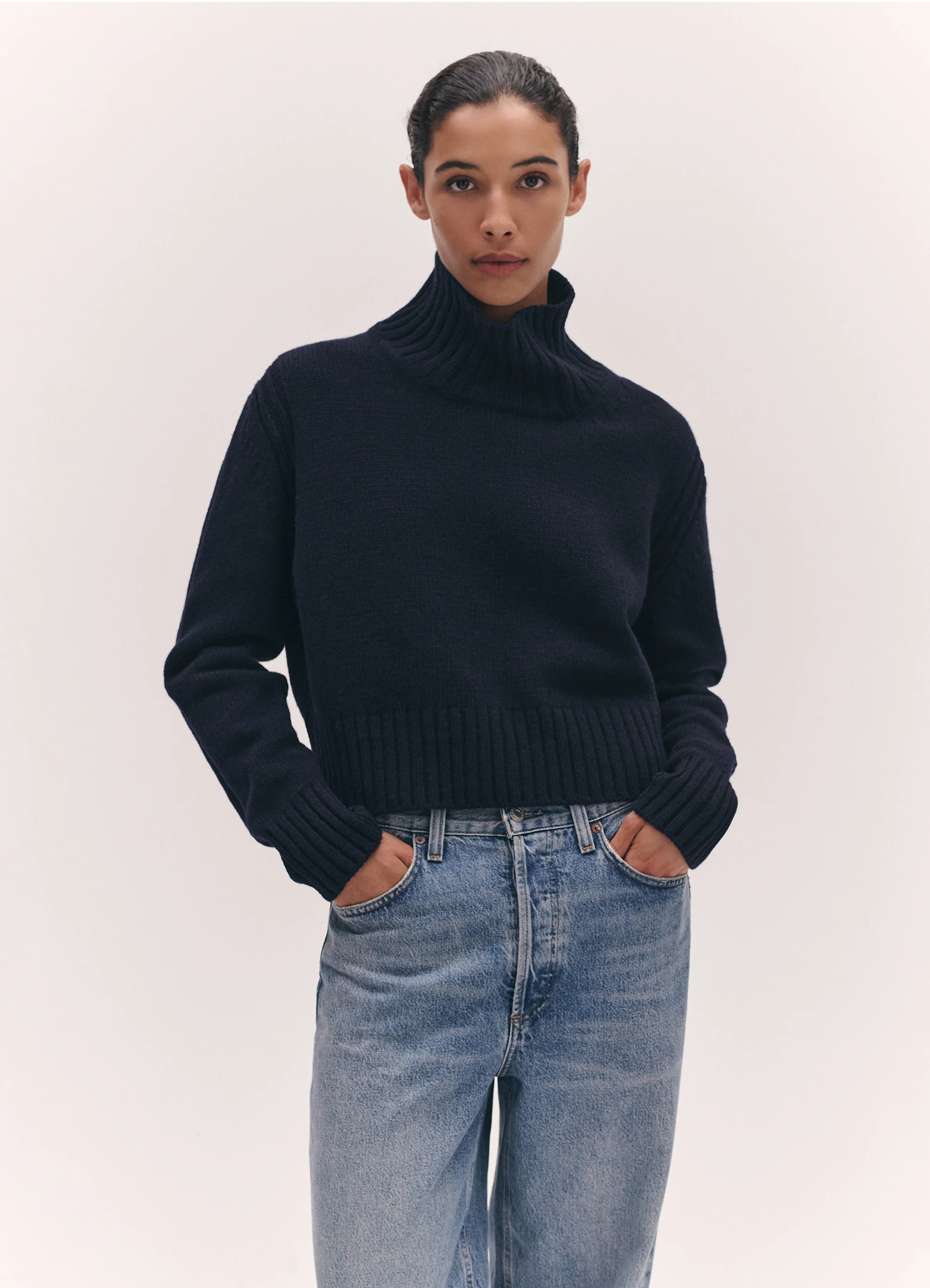 Our Fintra Knit in soft and warm 4-ply navy lambswool is a timeless piece. Designed with a waist-skimming length, proportions are neat with a long sleeve, dropped shoulder, and jaw-grazing chunky ribbed collar. Finished with signature rib detailing at shoulder and sleeve. Knit in pure, Yorkshire-spun lambswool.