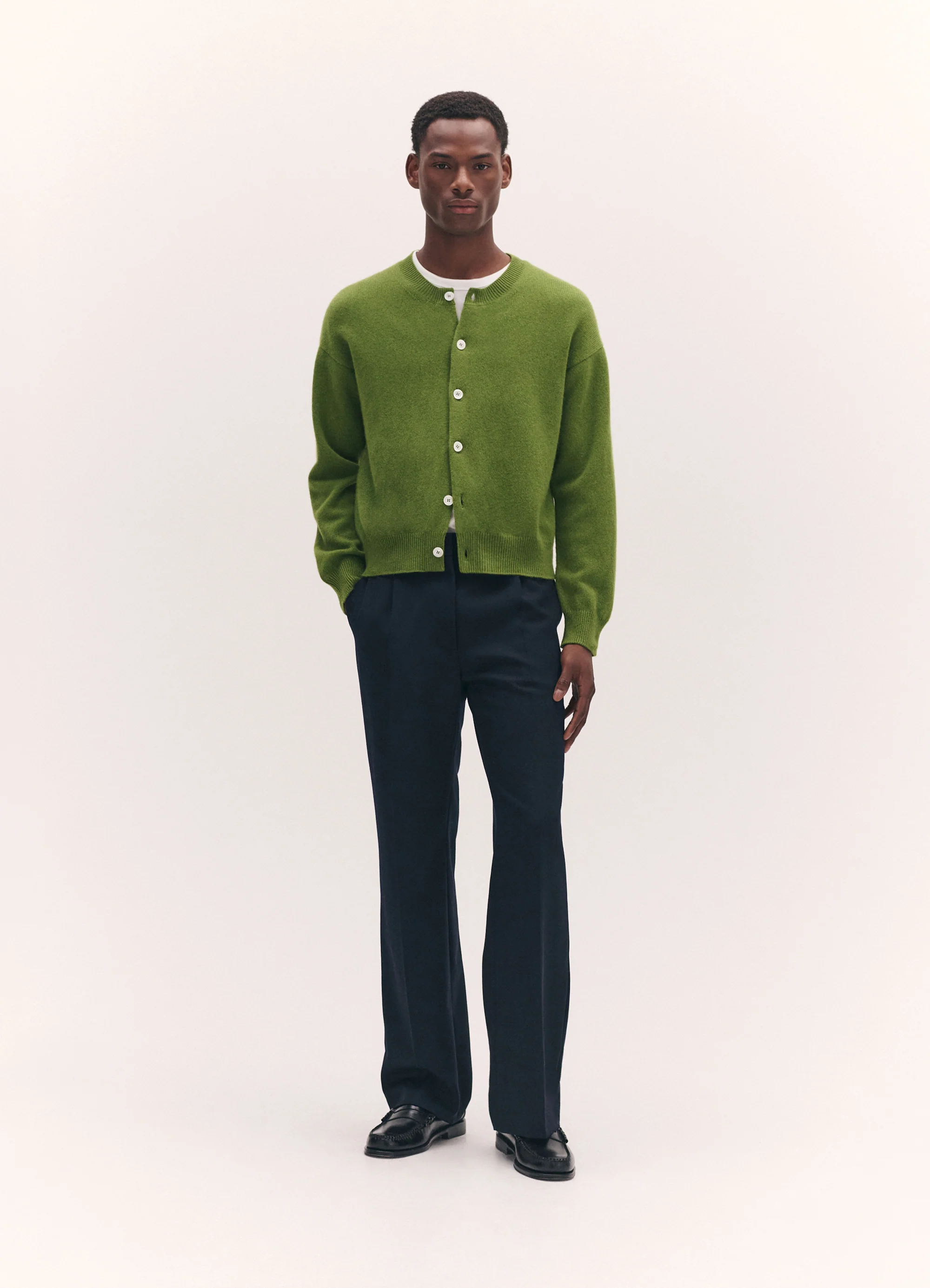 Godwin wears the Ada Crewneck Cardigan in Pickle Green styled with the XL Foulard in Charcoal Grey.