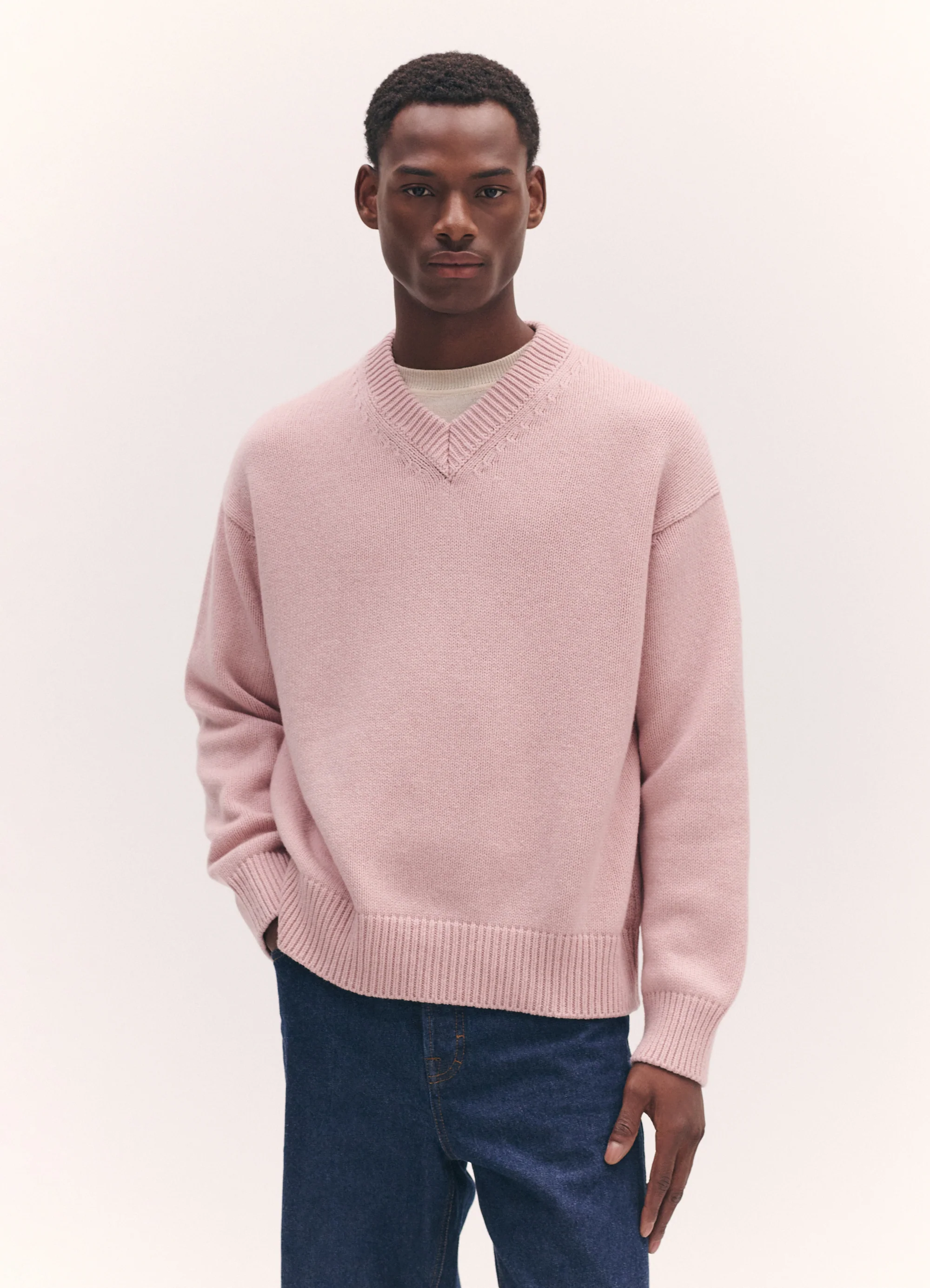 Godwin wears the Balla Slouch V-Neck in Pale Pink styled with the Emer Cashmere T-Shirt in Canvas.