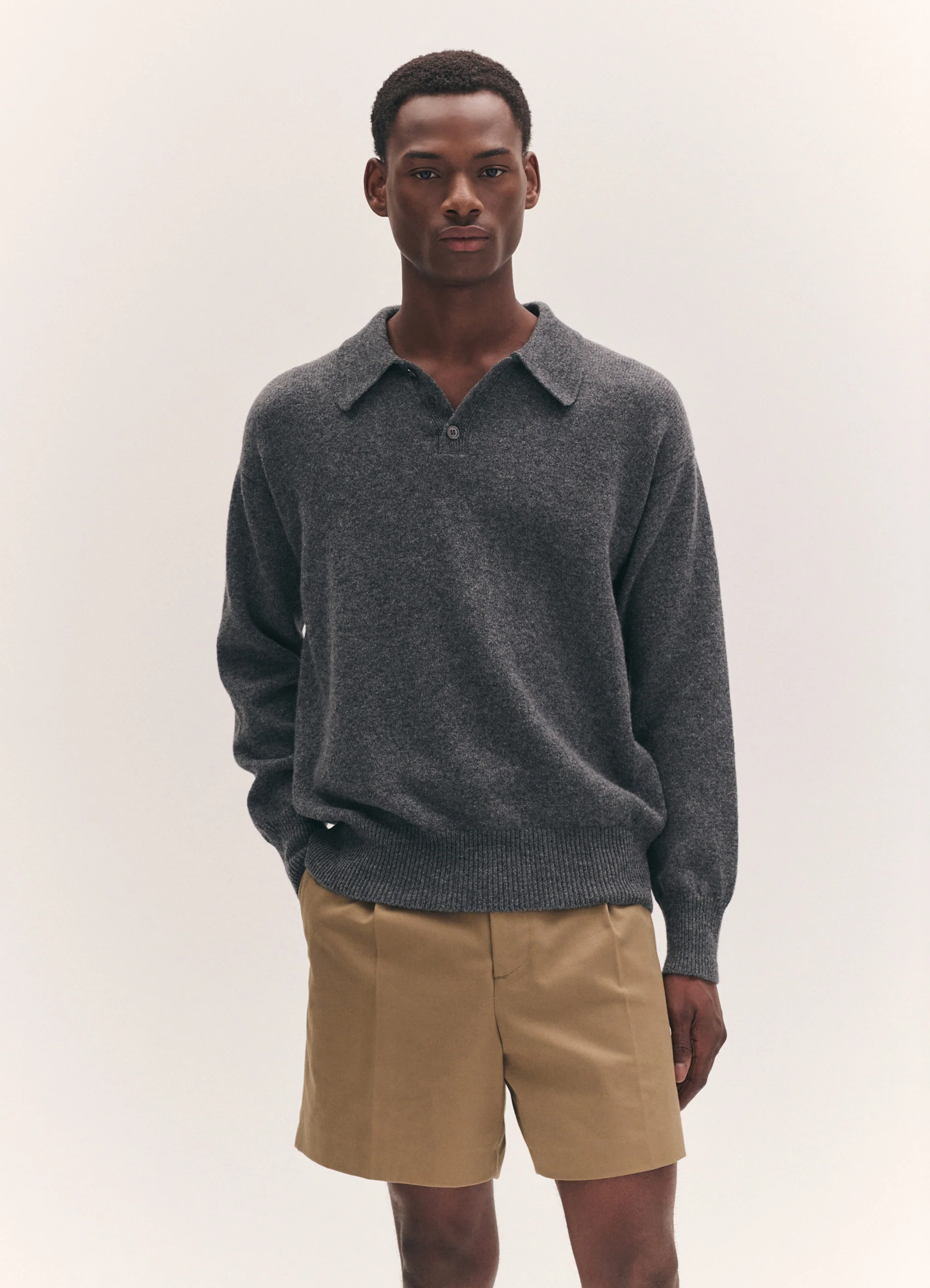 In soft Scottish-spun lambswool, the Edith Polo Shirt is vintage sports-inspired, in derby grey. In a soft-silhouette with a slight dropped shoulder for subtle drape. Finished with rib cuff and collar and trocas shell buttons.