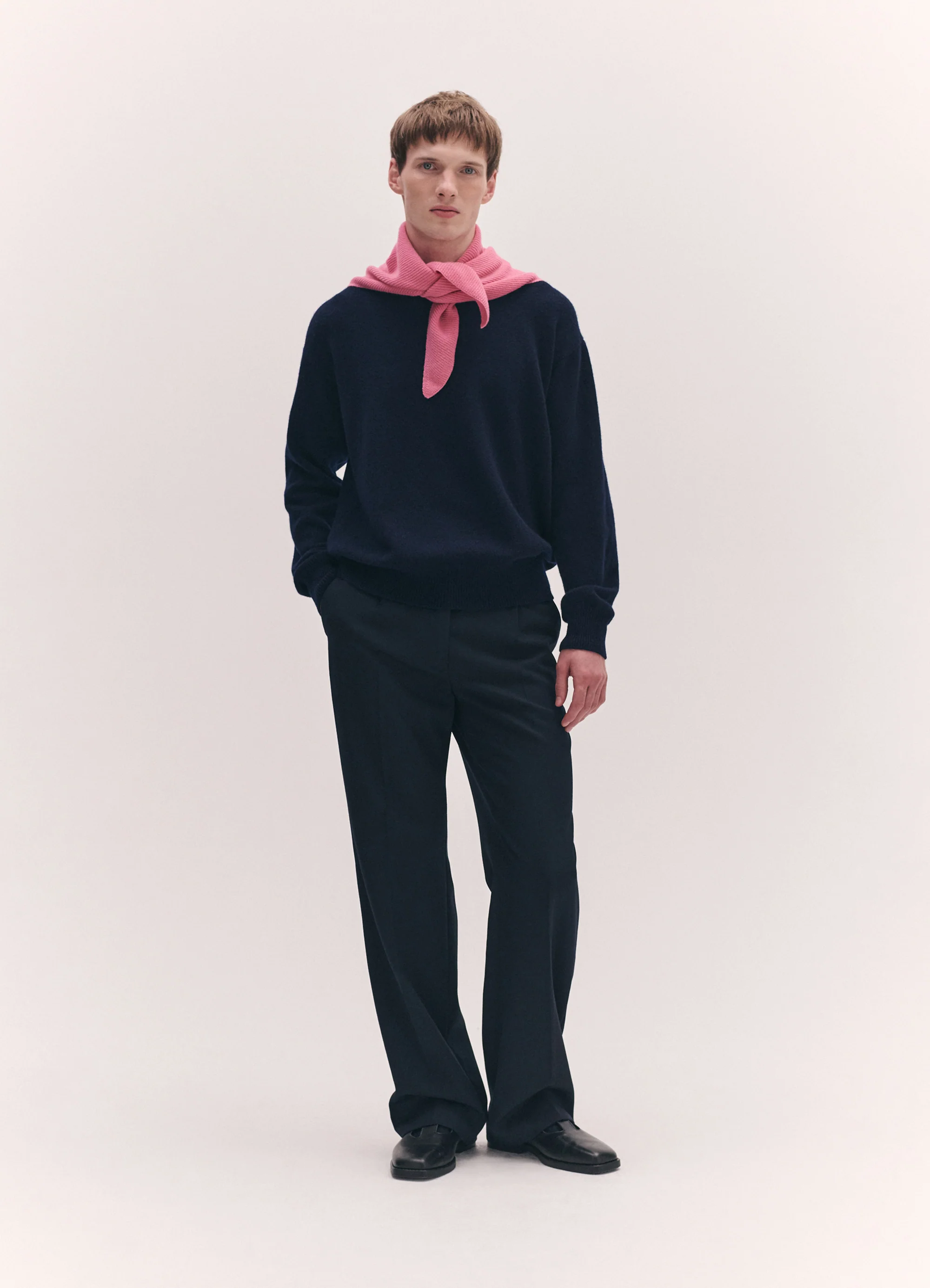 Oleks wears the Mens Innes Slouch Crewneck in Navy styled with the XL Cashmere Foulard in Pink.