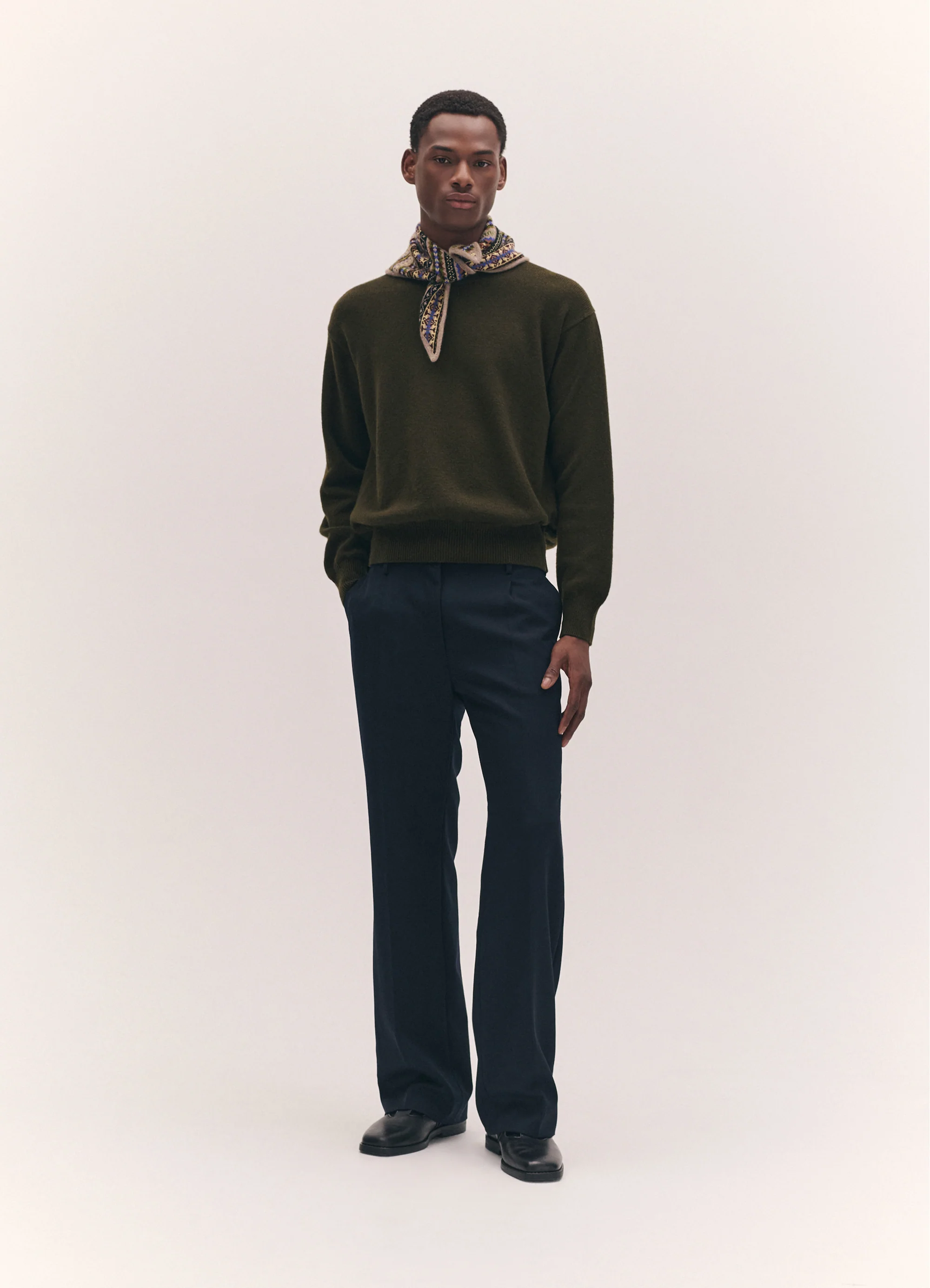 Godwin wears the Mens Innes Slouch Crewneck in Military Green styled with the Fairisle Cashmere Foulard in Dark Natural.