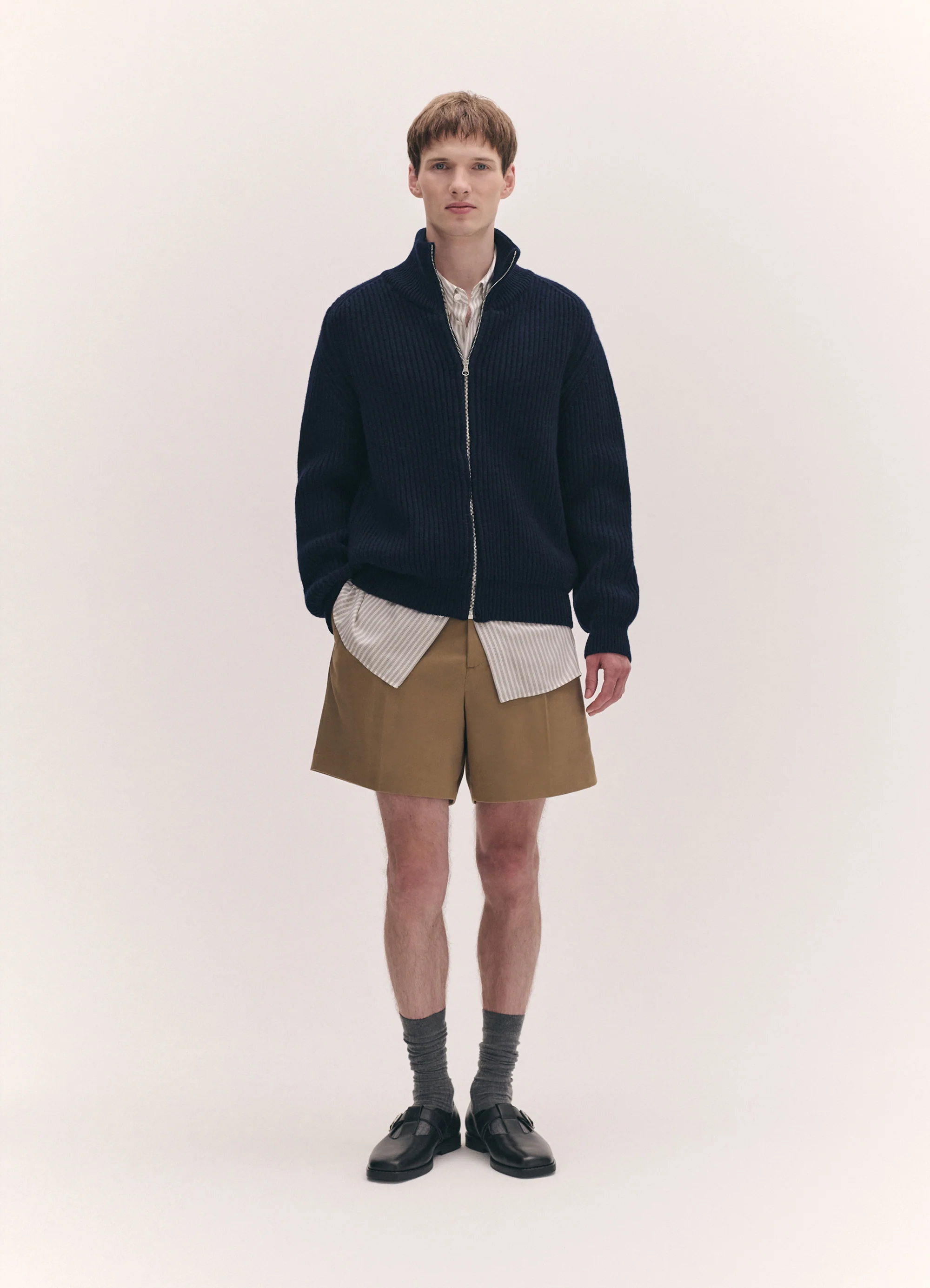 The Rea Rib Jacket in Dark Navy. Knitted in Responsible Wool Standard certified lambswool, in a chunky knit, textured rib stitch with zip-through front and high rib collar. With a drop shoulder and gently slouched proportions for a sense of comfort and ease.Ā