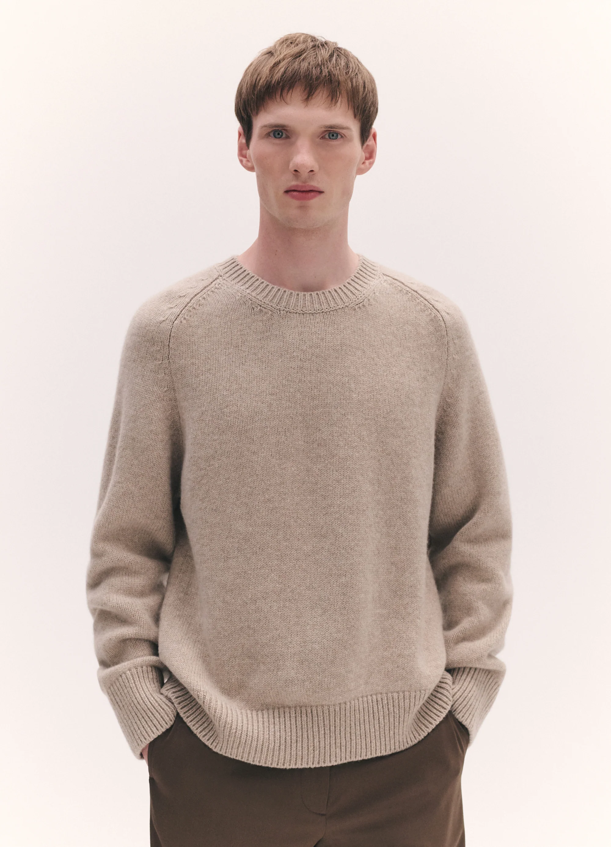 Oleks wears the Mens Rosh Crewneck in Oat styled with the XL Cashmere Foulard in Dark Natural.