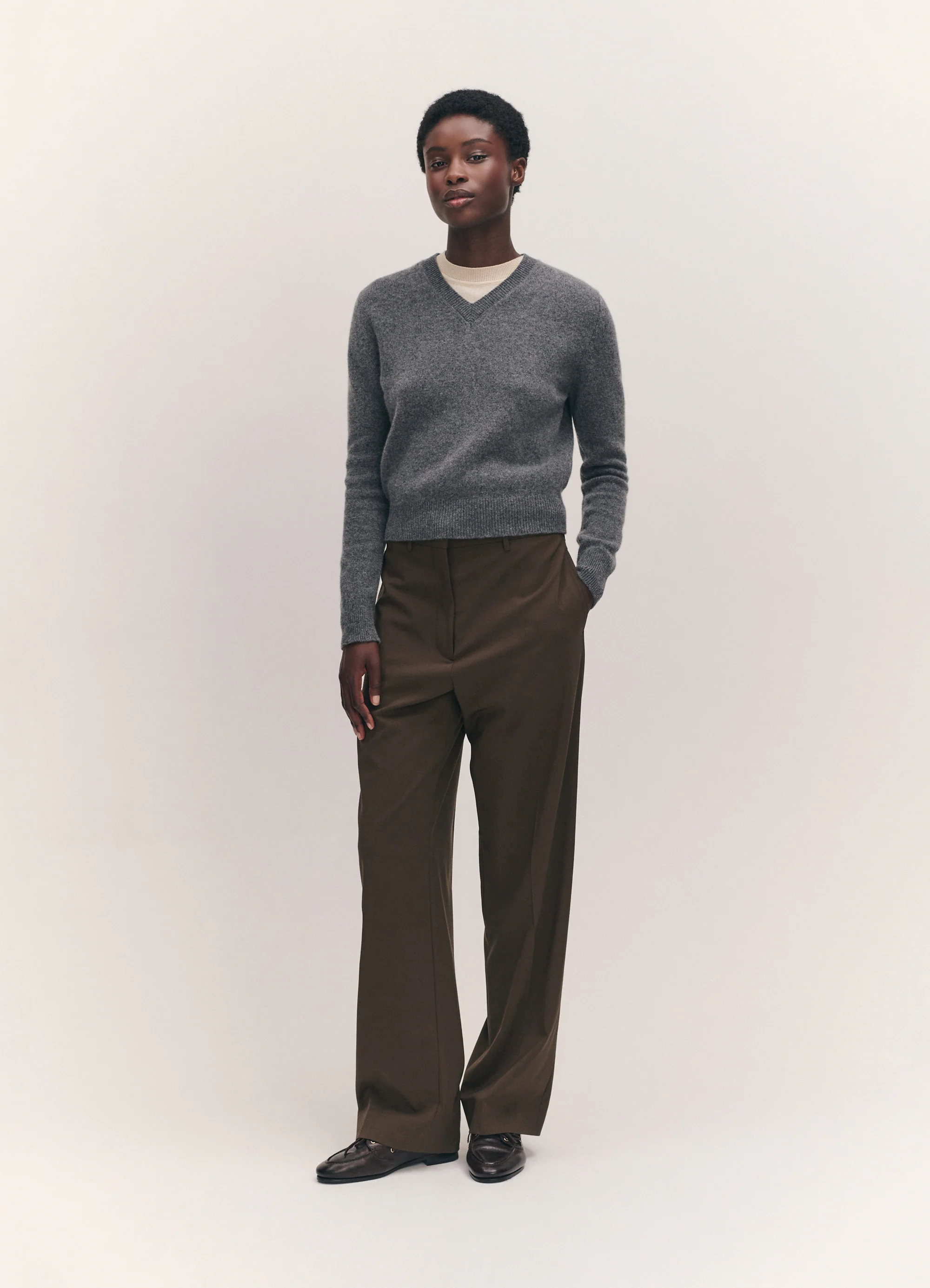 Jacqui wears the Sligo Shrunken V-Neck in Derby Grey styled with the Emer Cashmere T-Shirt in Canvas.