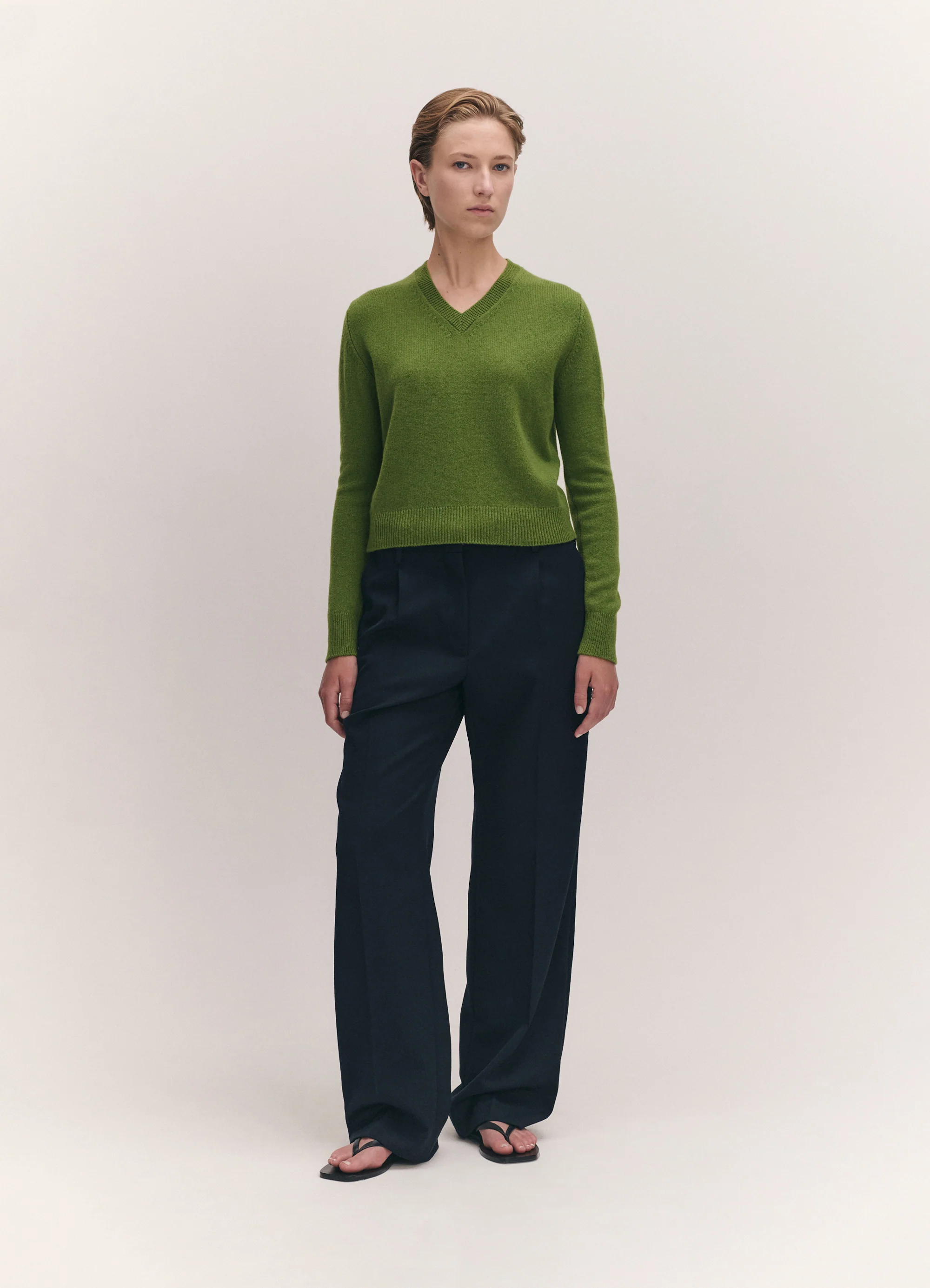 Introducing the new Sligo V-Neck in 7-ply Geelong wool. A modern knit shrunken v-neck, perfect for styling between seasons. This style has a neat, slightly shrunken fit, sitting just above the hips and features a ribbed crewneck, hem and cuffs.