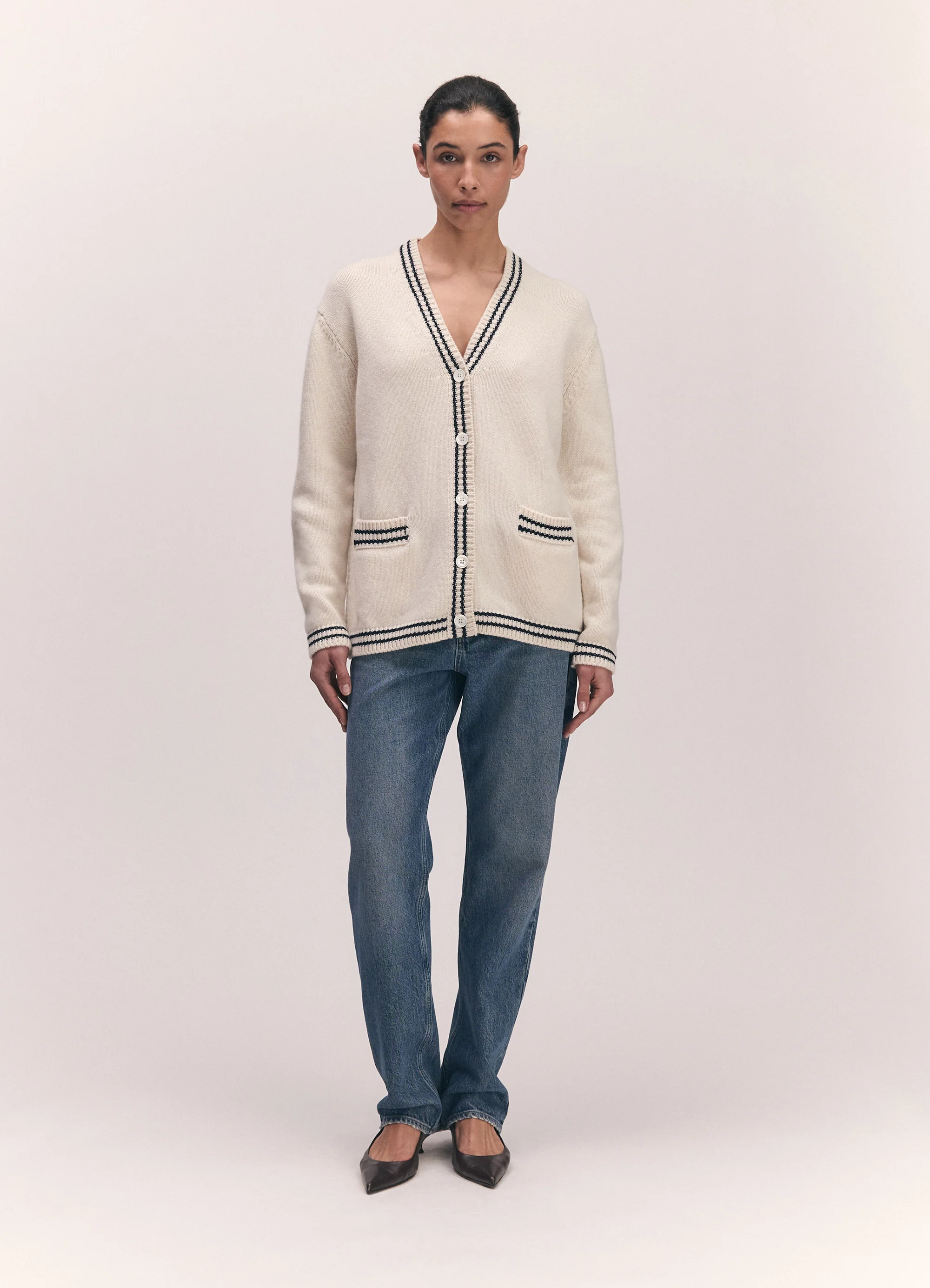 Knitted in 100% Geelond Lambswool using RWS-certified yarn, proportions are softly relaxed to create a flattering, easy silhouette designed for layering. Finished with a clean ecru base and signature navy stripe trim at the neckline, placket, hem and cuffs, and completed with responsibly sourced Trocas shell buttons.