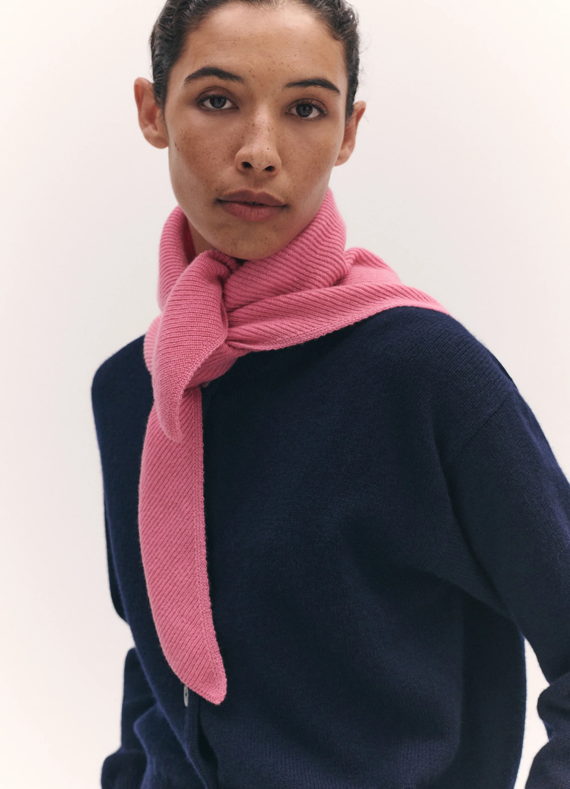 Maya wears the XL Cashmere Foulard in Pink styled with the Ada Crewneck Cardigan in Navy.