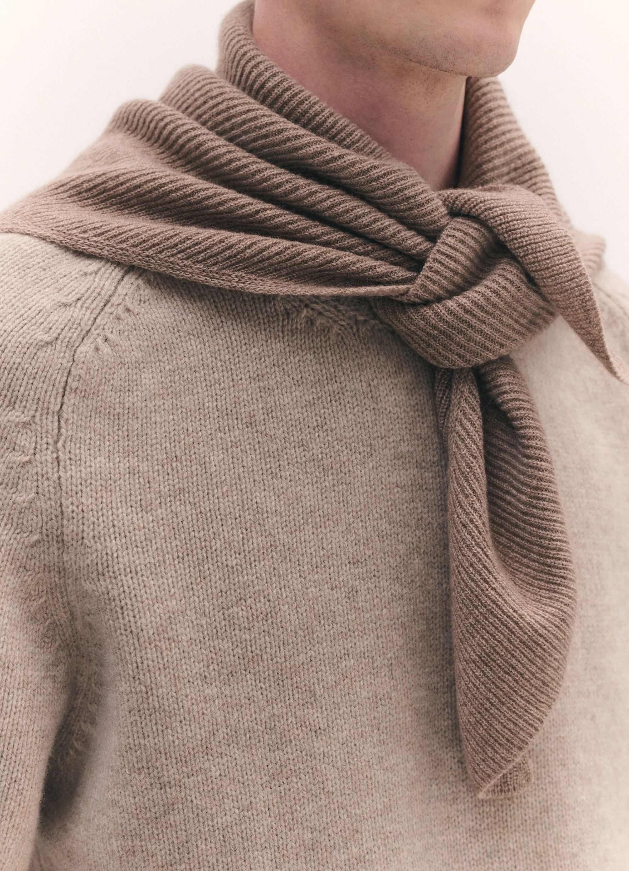 Oleks wears the XL Cashmere Foulard in Dark Natural styled with the Rosh Crewneck in Oat.