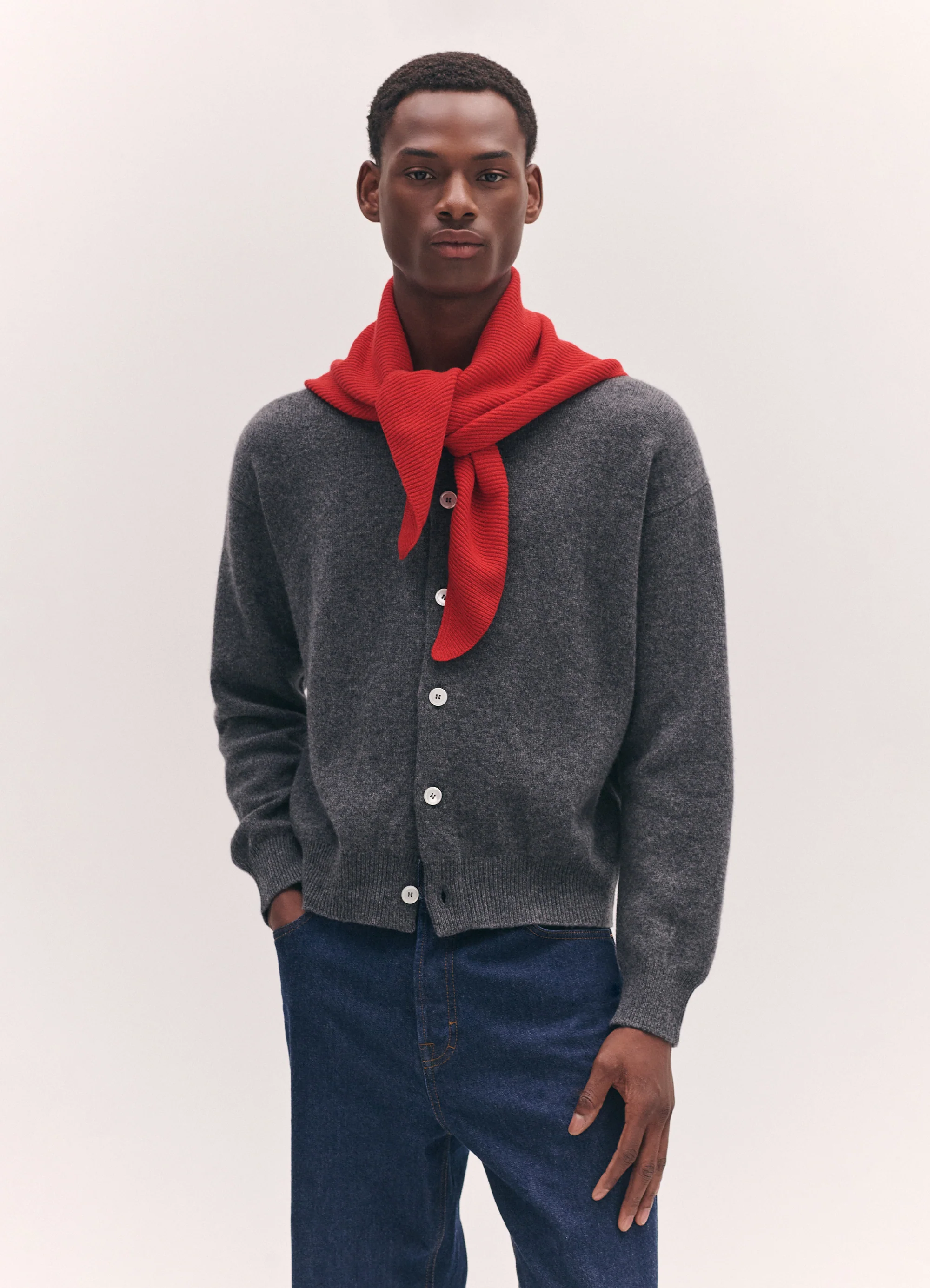 Godwin wears the XL Cashmere Foulard in Poppy Red styled with the Ada Crewneck Cardigan in Derby Grey.